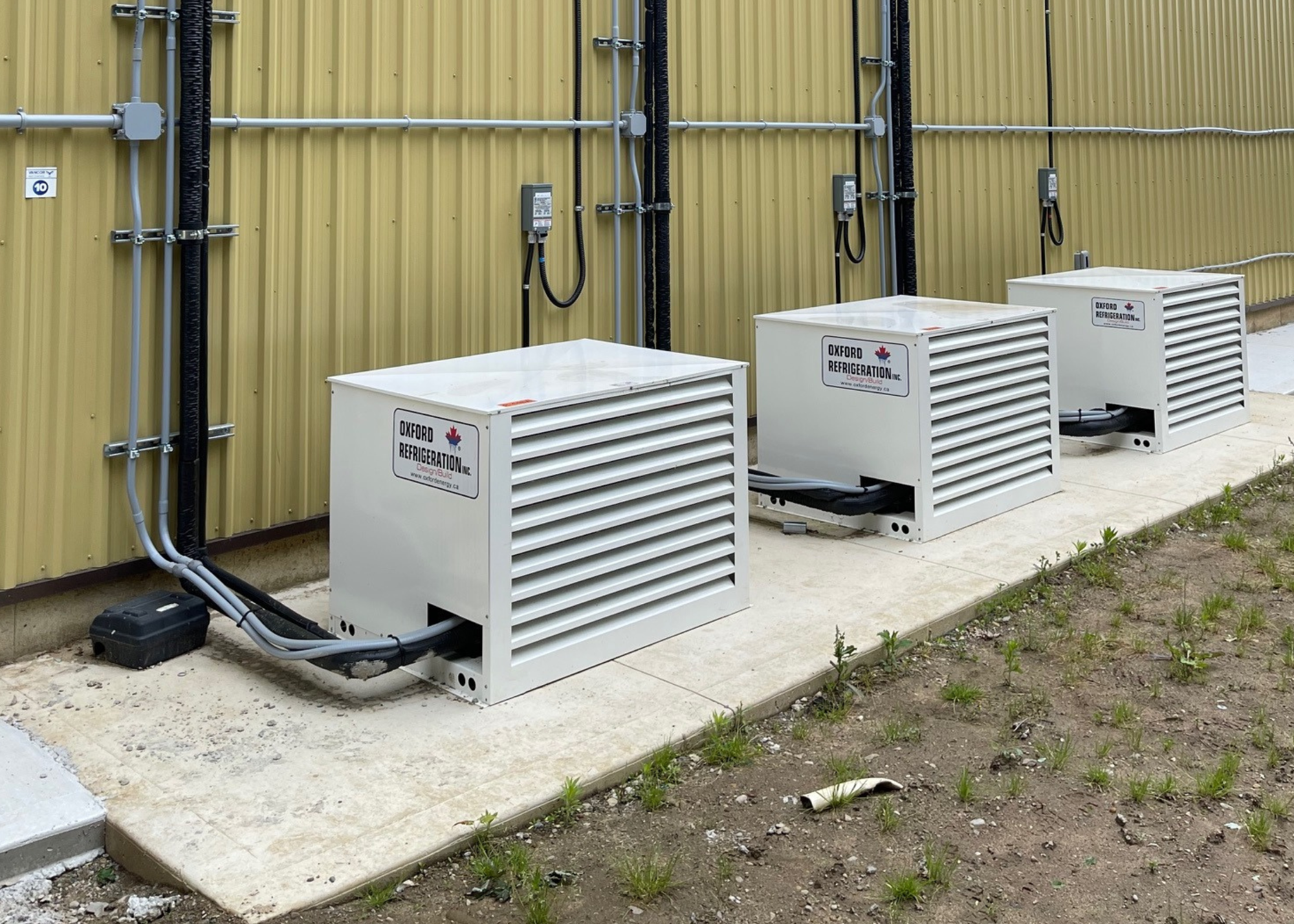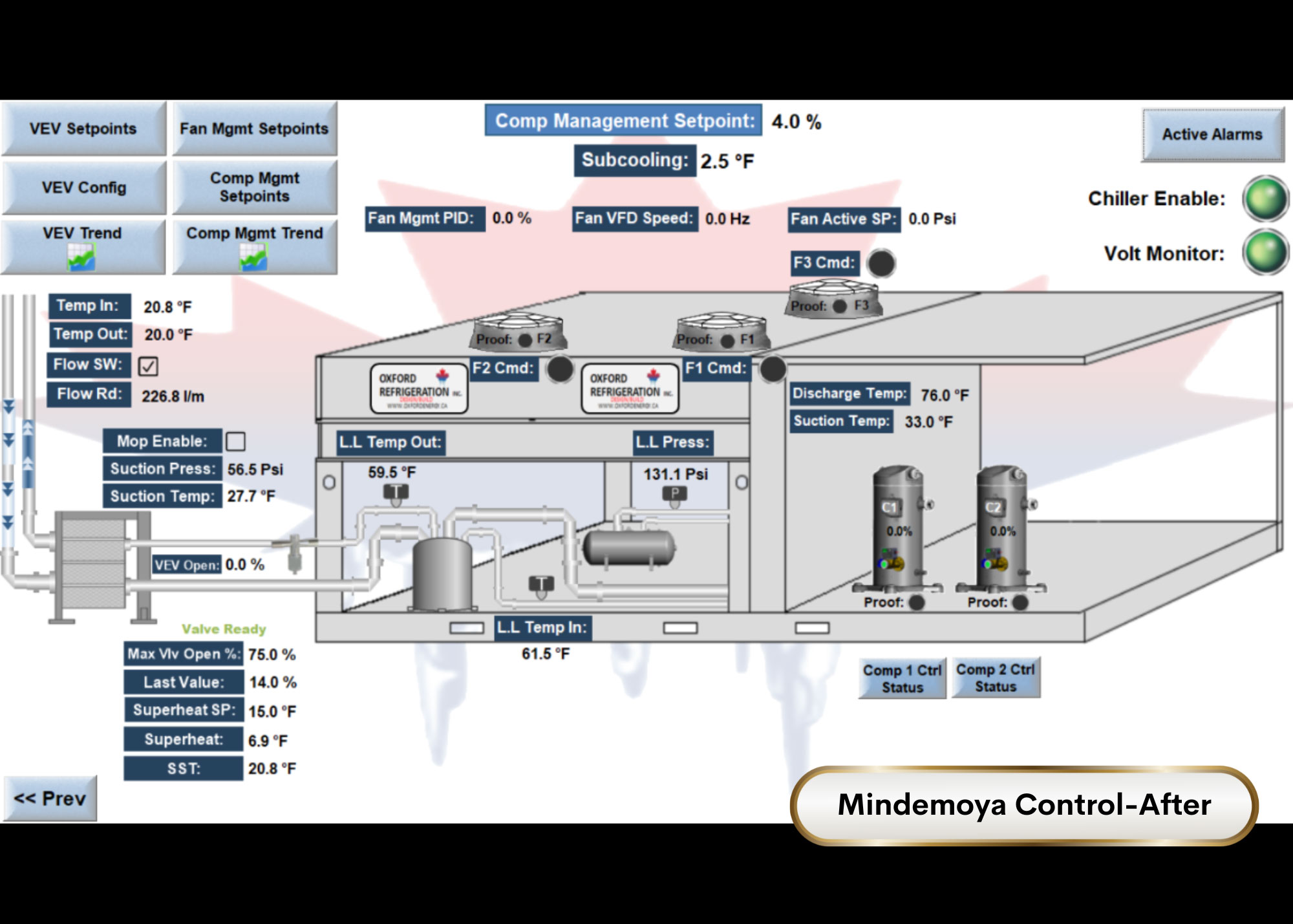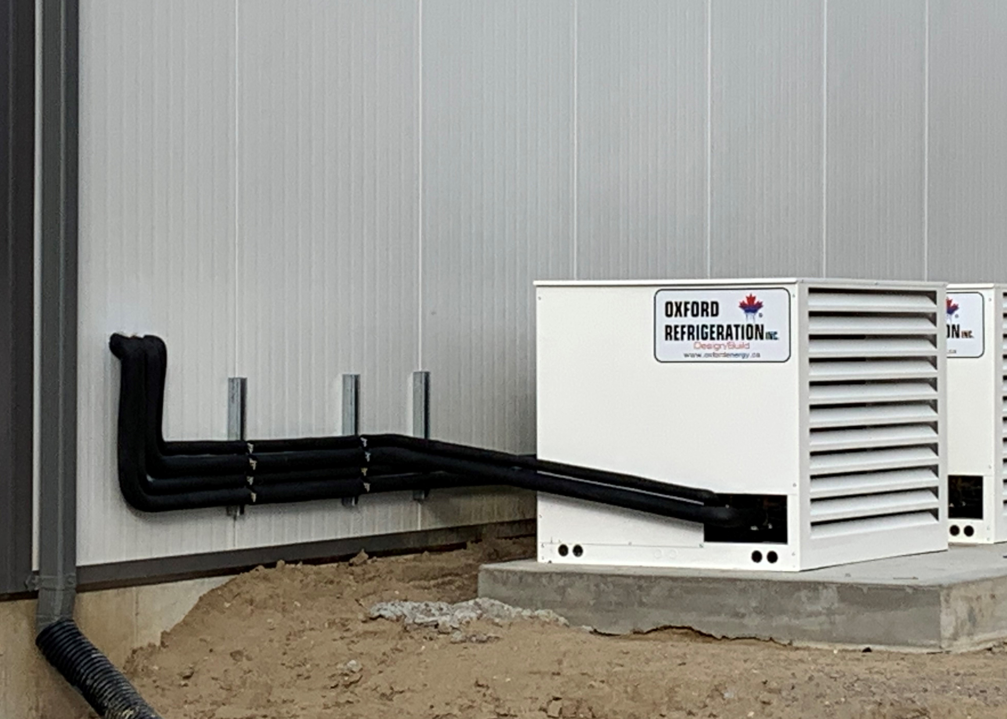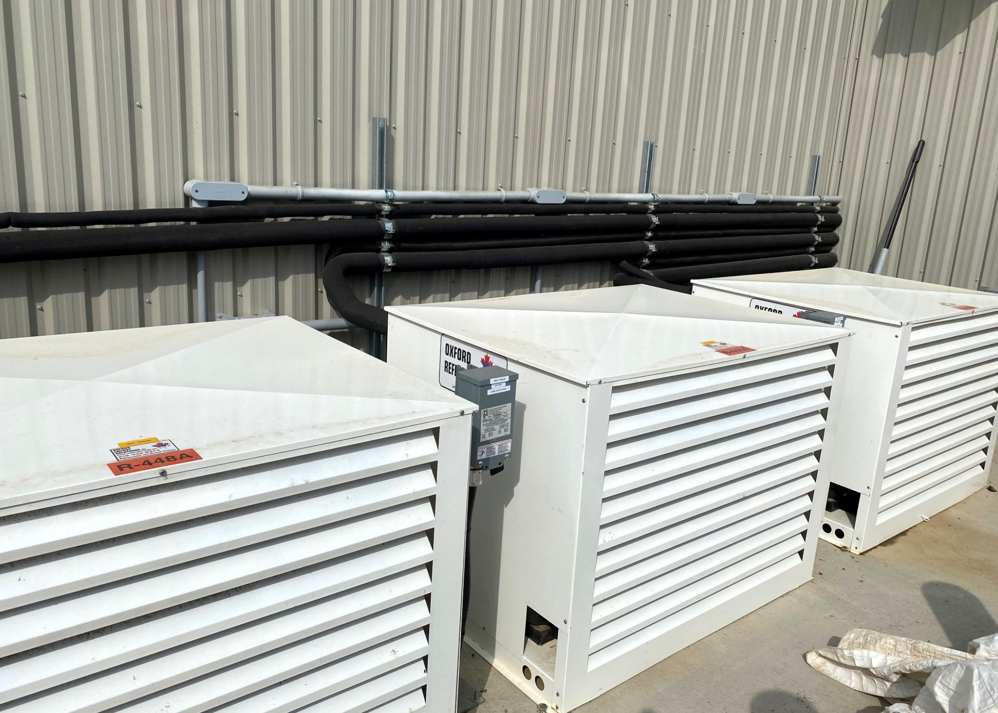 The Oxford LPP® operating through 42 degree summer days and -20 degree winter nights averages 5 kW of power, maximum of 18 kW during the highest peak. That is less than 60 amps peak power on 208/3 phase. This value includes all caseloads and evaporator/defrost loads, condenser fans, etc. to encapsulate the entire refrigeration platform. Due to the variable speed compressors on medium and low profiles, there is never a large inrush on the system.