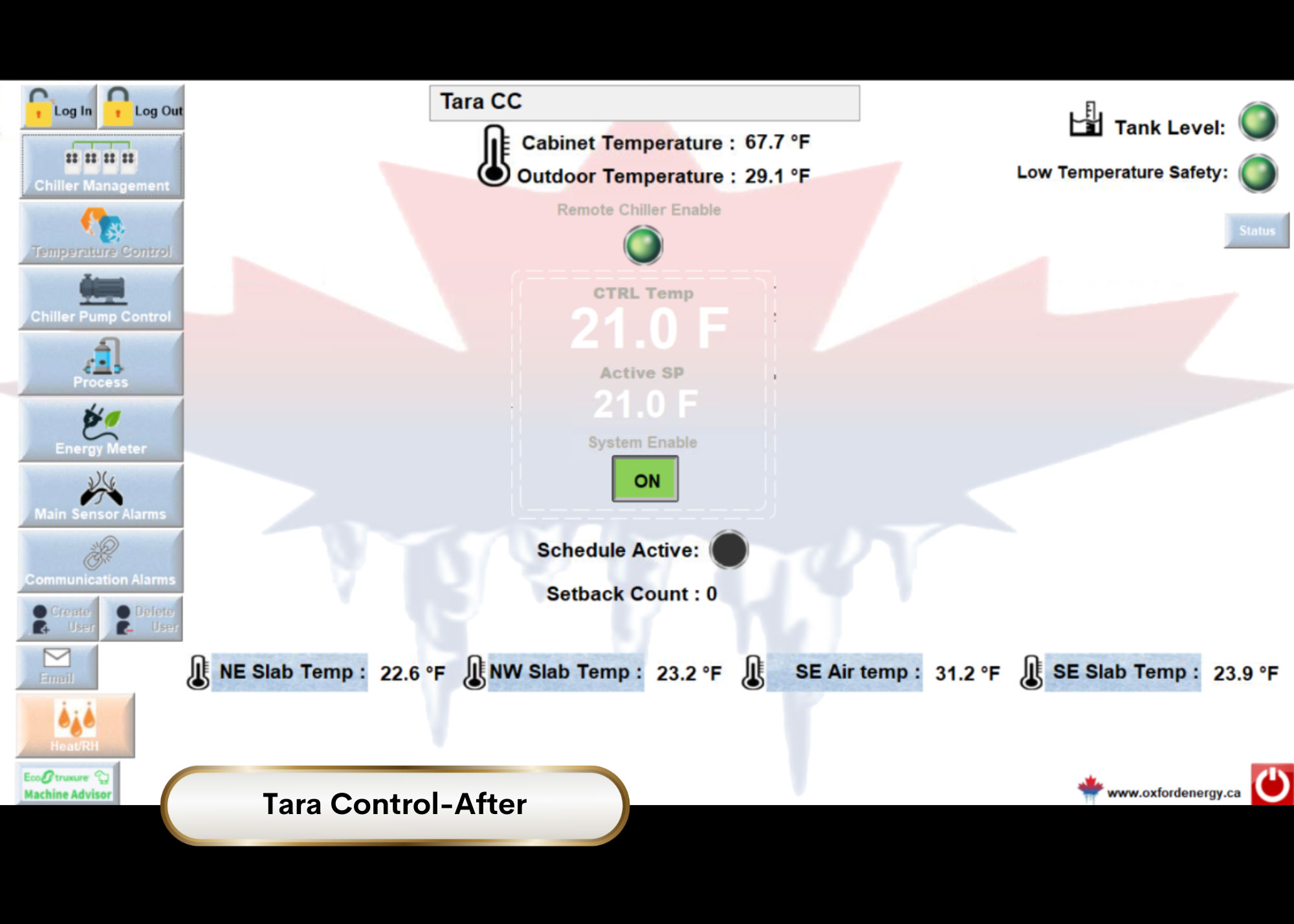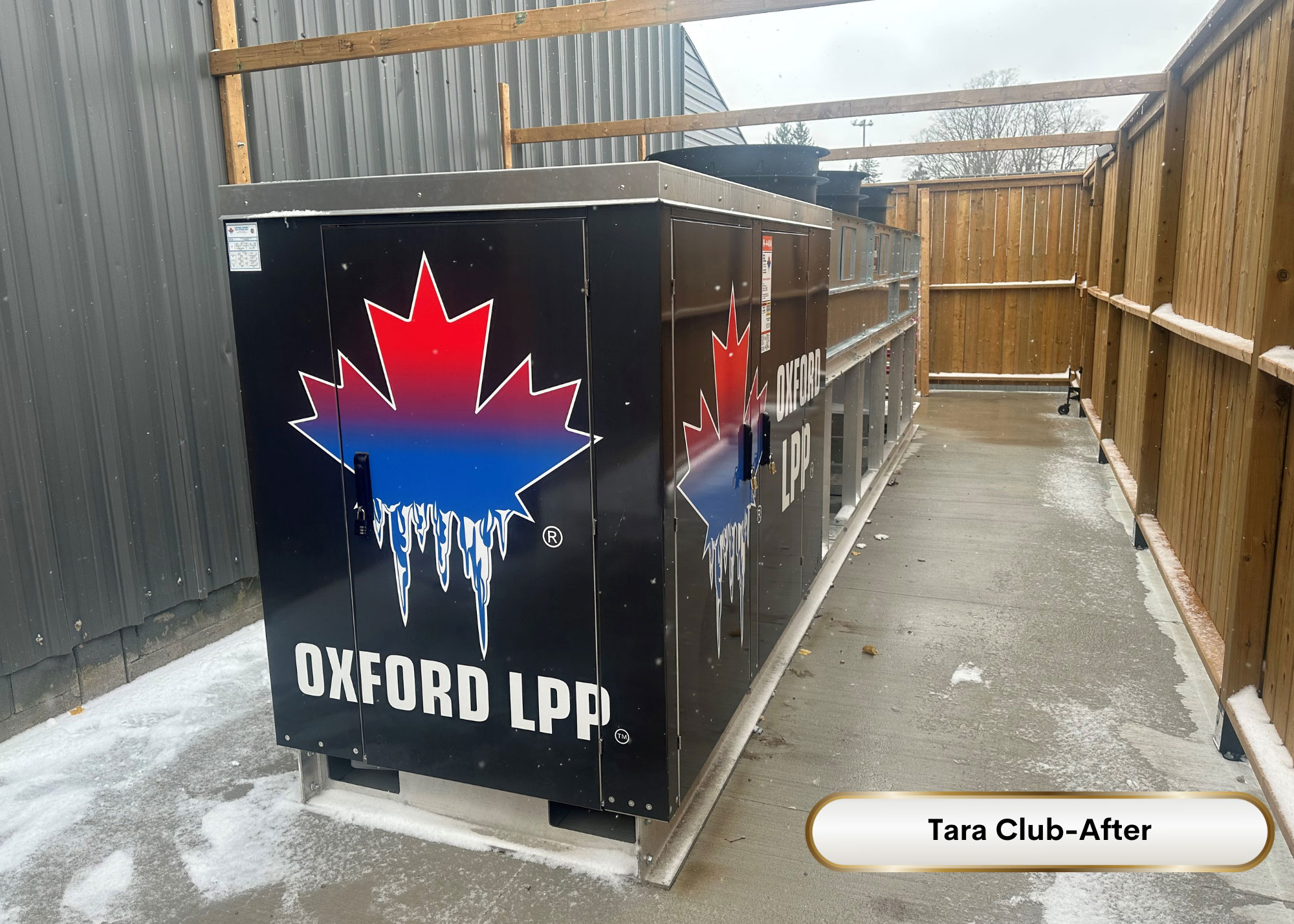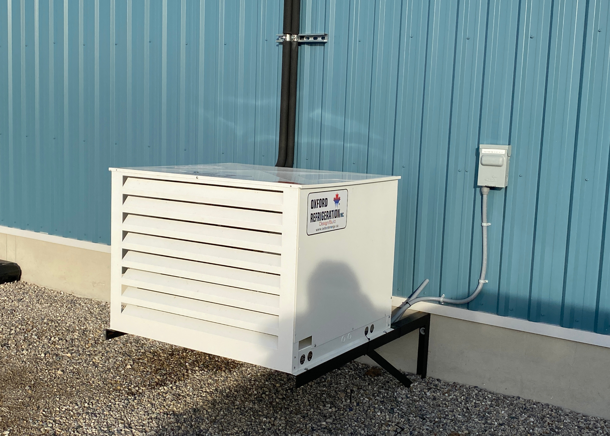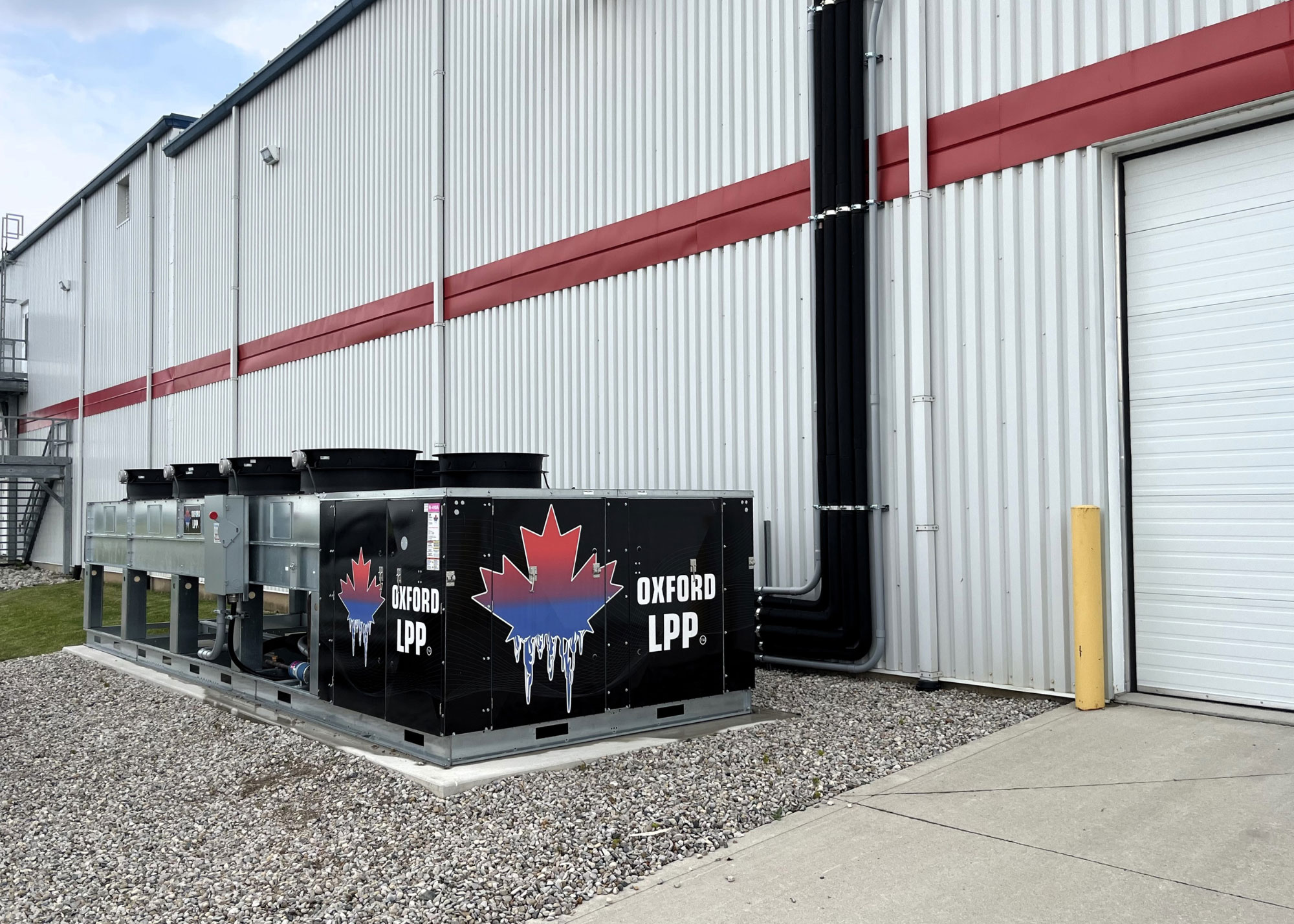 The Oxford LPP® operating through 42 degree summer days and -20 degree winter nights averages 5 kW of power, maximum of 18 kW during the highest peak. That is less than 60 amps peak power on 208/3 phase. This value includes all caseloads and evaporator/defrost loads, condenser fans, etc. to encapsulate the entire refrigeration platform. Due to the variable speed compressors on medium and low profiles, there is never a large inrush on the system.